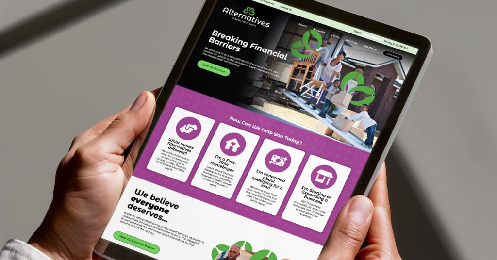 In addition to the brand redesign, we launched a user-friendly website that places their mission at the forefront, ensuring members can easily access resources and feel supported every step of the way. The site’s design differentiates Alternatives from other credit unions and banks, focusing on their unique commitment to empowering the community.