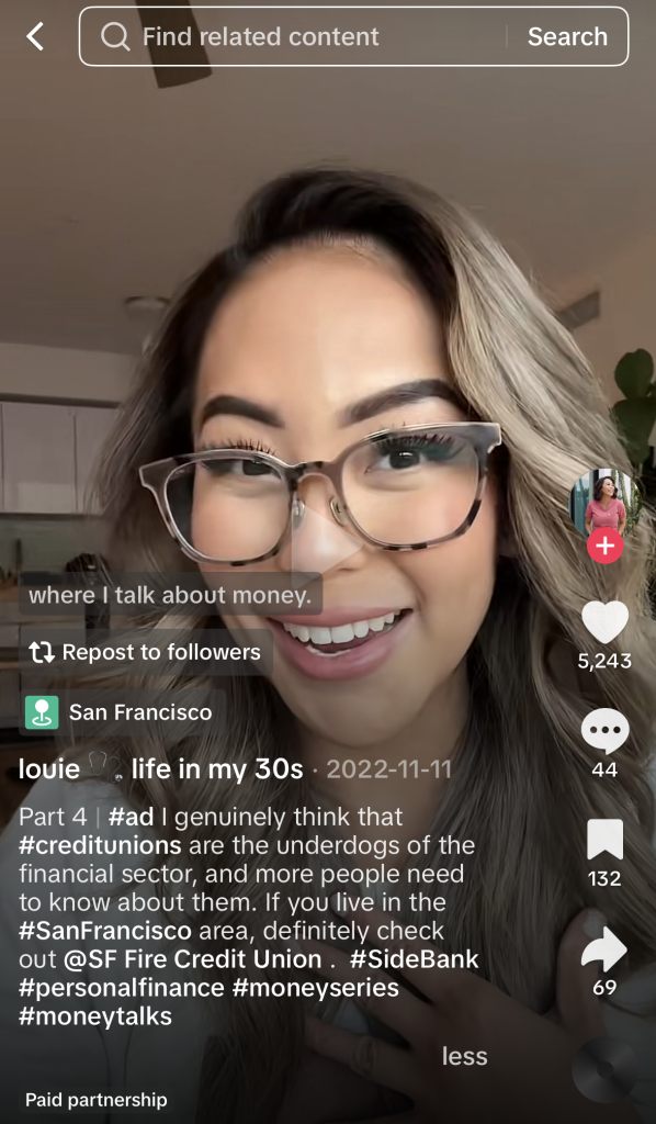 Check out the two examples below from TikTok influencers @geezelouiseeeee and @baxate_carter. Both videos have over 1.5 million views and thousands of interactions. Louie’s video discusses why she believes credit unions are the underdogs of the financial industry, and Baxate discusses his 10 steps to financial freedom. With hundreds of thousands of loyal followers and millions of views, imagine the number of potential members your credit union could reach.
