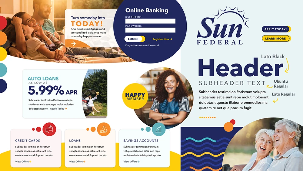 Our initial work with Sun Federal focused on evolving how their existing brand was expressed across digital and marketing channels. By evaluating their brand integration, we introduced a refreshed tagline—“Banking Made Brighter”—and designed a website experience that blends playfulness with functionality, bringing their sunny brand identity to life.
